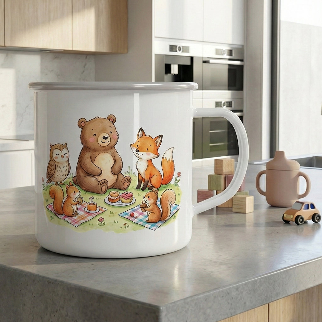 Šalica izrađena od bijelog emajla koja se može printati u punoj boji tehnikom sublimacije. Lagana je i ima ravno dno što joj daje stabilnost. Idealna je za kampiranje ili planinarenje.