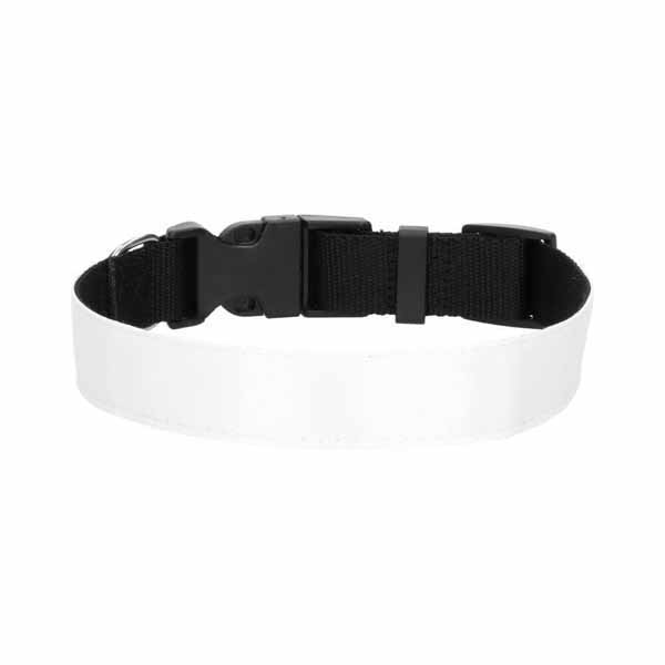 Ogrlica je izrađena od čvrstog crnog tekstila s plastičnom kopčom, a traka se može podešavati kako bi savršeno pristajala psu. Vanjska strana izrađena je od bijelog poliestera, što omogućuje jednostavnu personalizaciju sublimacijom.