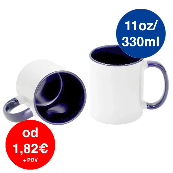 Keramička šalica kapaciteta 11oz / 330 ml s tamnoplavom unutrašnjošću i ručkom spremna je za sublimaciju. Zahvaljujući prozirnom polimernom premazu može se personalizirati dodavanjem fotografije, logotipa ili teksta.