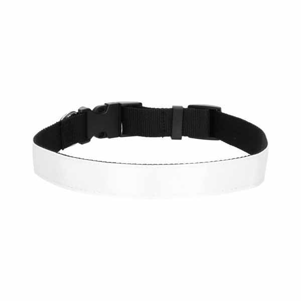 Ogrlica je izrađena od čvrstog crnog tekstila s plastičnom kopčom, a traka se može prilagoditi tako da savršeno pristaje psu. Vanjska strana obložena je bijelim poliesterom koji omogućuje jednostavnu personalizaciju sublimacijom.