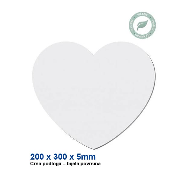 Podloga za miš u obliku srca izrađena je od crne gume s bijelim poliesterskim gornjim slojem. Crna guma čini podlogu protukliznom tako da ostaje na mjestu. Mekani gornji sloj prikladan je za personalizaciju sublimacijom.